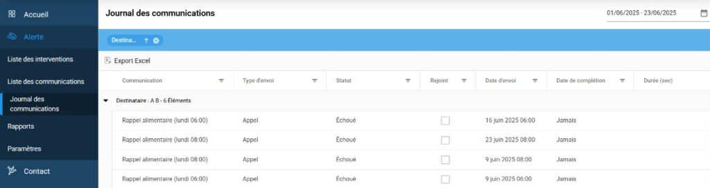 Le menu AlerteJournal des communications regroupe toutes les communications envoyées à chaque contact durant une période donnée. ​Elles sont triées par défaut par date d’envoi, de la plus récente à la plus ancienne.​
