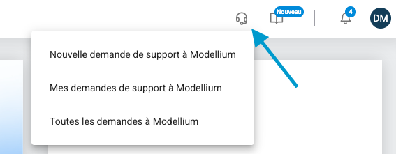Vous pouvez soumettre vos demandes de support technique à Modellium, en cliquant sur le casque d’écoute en haut à droite de votre tableau de bord de production.