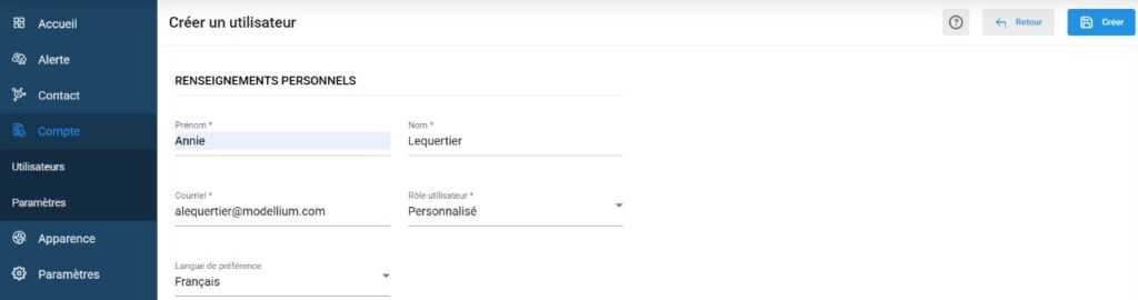 Pour créer un nouvel utilisateur depuis le menu Compte → Utilisateurs :