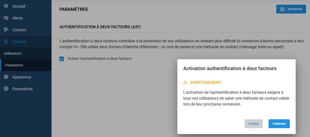 A partir du menu Compte → Paramètres, cochez la case Activer l’authentification à deux facteurs, puis cliquez sur Enregistrer.