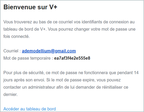 - Le nouvel utilisateur recevra un courriel contenant ses identifiants de connexion et un lien pour accéder au tableau de bord.
