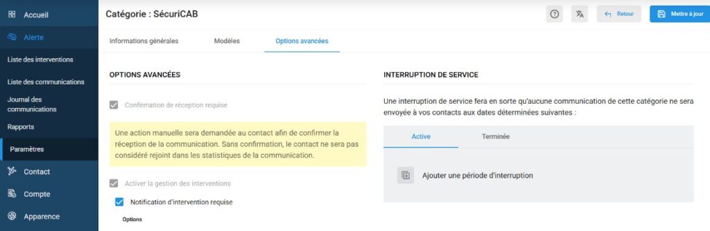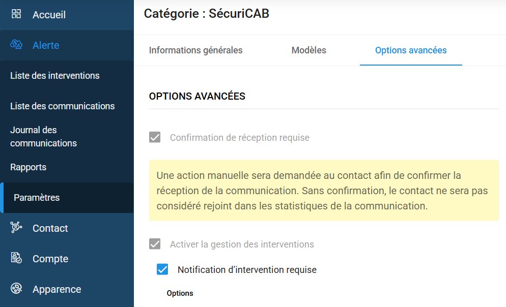 - Rendez-vous dans le menu Alerte → Paramètres, puis Catégories → SécuriCAB, onglet « Options avancées ».