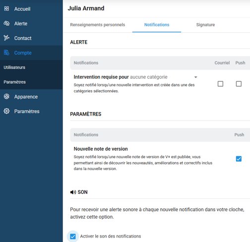Vous pouvez activer un son à la réception d’une notification via la cloche :